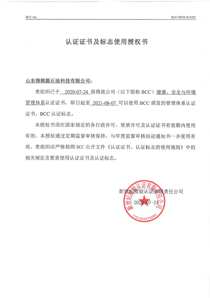 On August 13th 2020, the notice from Beijing New Century Inspection and Certification Co., Ltd., shows that the company has successfully passed the external supervision and audit of HSE certification of health, safety and environment management system. The management system meets the requirements of standard, therefore the company will continue to maintain the certification registration qualification, and the certificate continues to be valid as well.
