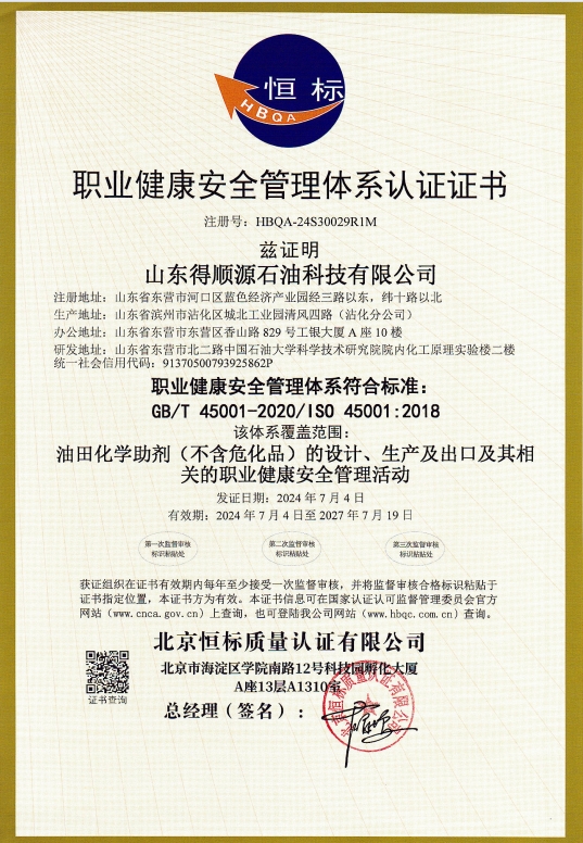 2024年7月4日,公司接到北京恒標(biāo)質(zhì)量認(rèn)證有限公司通知,順利通過了質(zhì)量管理體系、環(huán)境管理體系和職業(yè)健康安全管理體系認(rèn)證的再認(rèn)證審核,符合認(rèn)證標(biāo)準(zhǔn)的要求,繼續(xù)保持認(rèn)證注冊(cè)資格,證書持續(xù)有效。